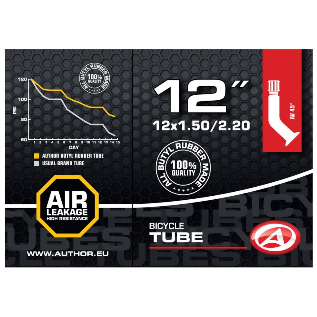 Duša AUTHOR 12x1.50-2.20 vyrobená zo 100% butylkaučuku s veľmi nízkou priepustnosťou pre plyny. Udrží tlak vzduchu v pneumatike bicykla po dlhšiu dobu, než duša vyrobené zo syntetickej gumy.