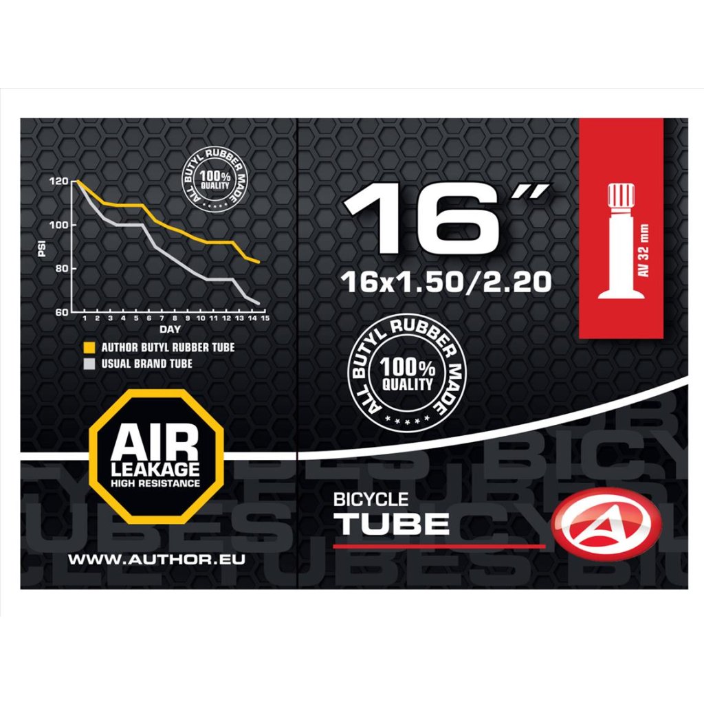Duša AUTHOR 16x1.50-2.20 vyrobená zo 100% butylkaučuku s veľmi nízkou priepustnosťou pre plyny. Udrží tlak vzduchu v pneumatike bicykla po dlhšiu dobu, než duša vyrobené zo syntetickej gumy.