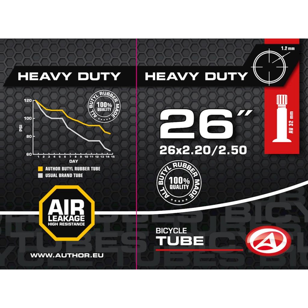 Duša AUTHOR 26x2,20-2,50 vyrobená zo 100% butylovej gumy s veľmi nízkou priepustnosťou pre plyny. Udrží tlak vzduchu v pneumatike bicykla po dlhšiu dobu, než duša vyrobená zo syntetickej gumy. Auto ventil 32 mm.
