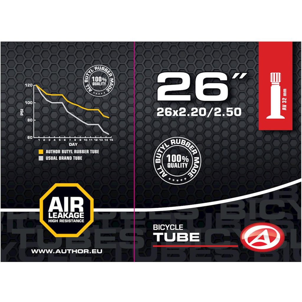 Duša AUTHOR 26x2.20-2.50 vyrobená zo 100% butylkaučuku s veľmi nízkou priepustnosťou pre plyny. Udrží tlak vzduchu v pneumatike bicykla po dlhšiu dobu, než duša vyrobené zo syntetickej gumy.