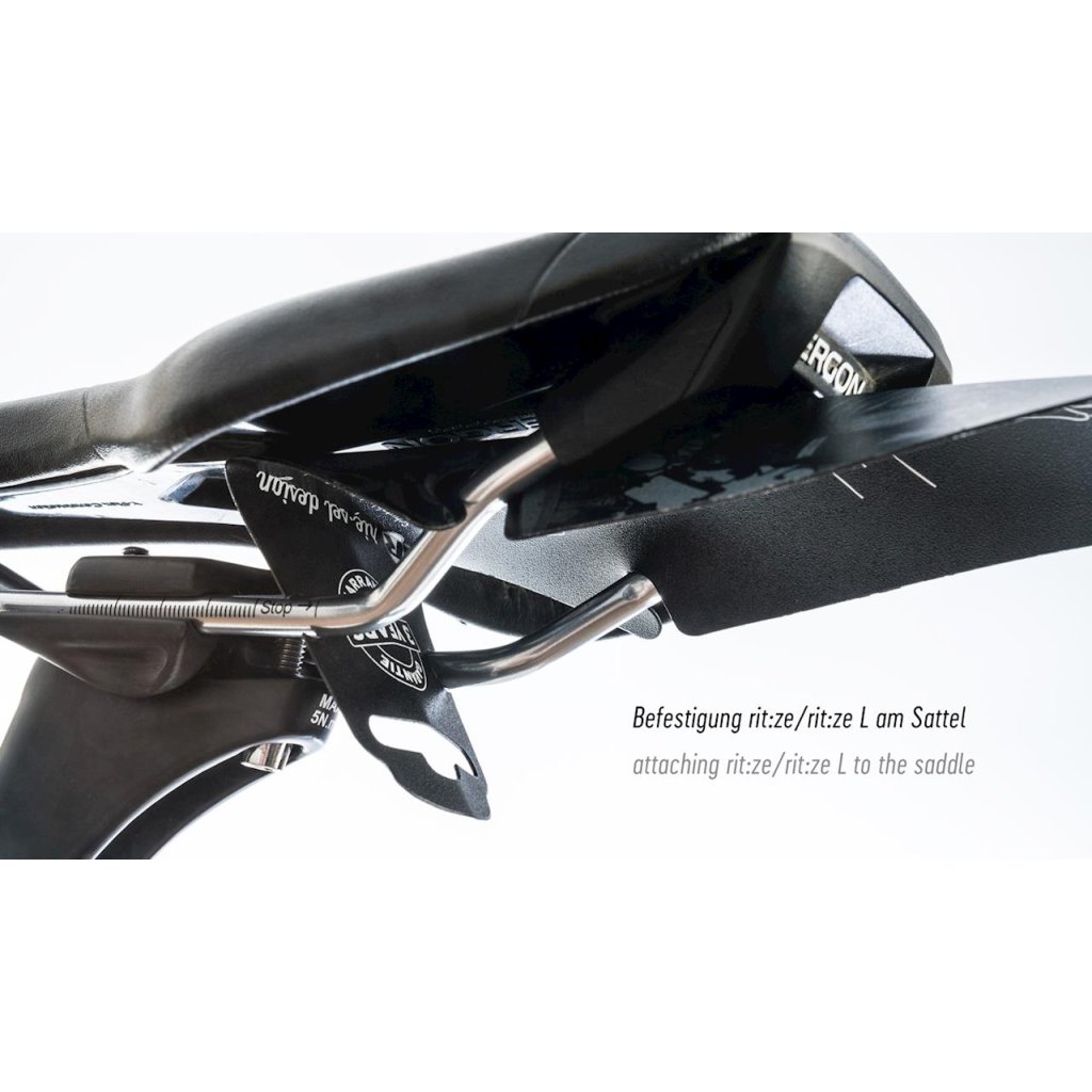 Väčší variant modelu Rit:ze - jednoduchý a funkčný blatníček pod sedlo v cool designu Rie:sel. Upevnenie na lyžiny sedla bez pomocou sťahovacích pások. Odolný proti poškriabaniu. Nie je možné upevniť na sedlá typu monorail.