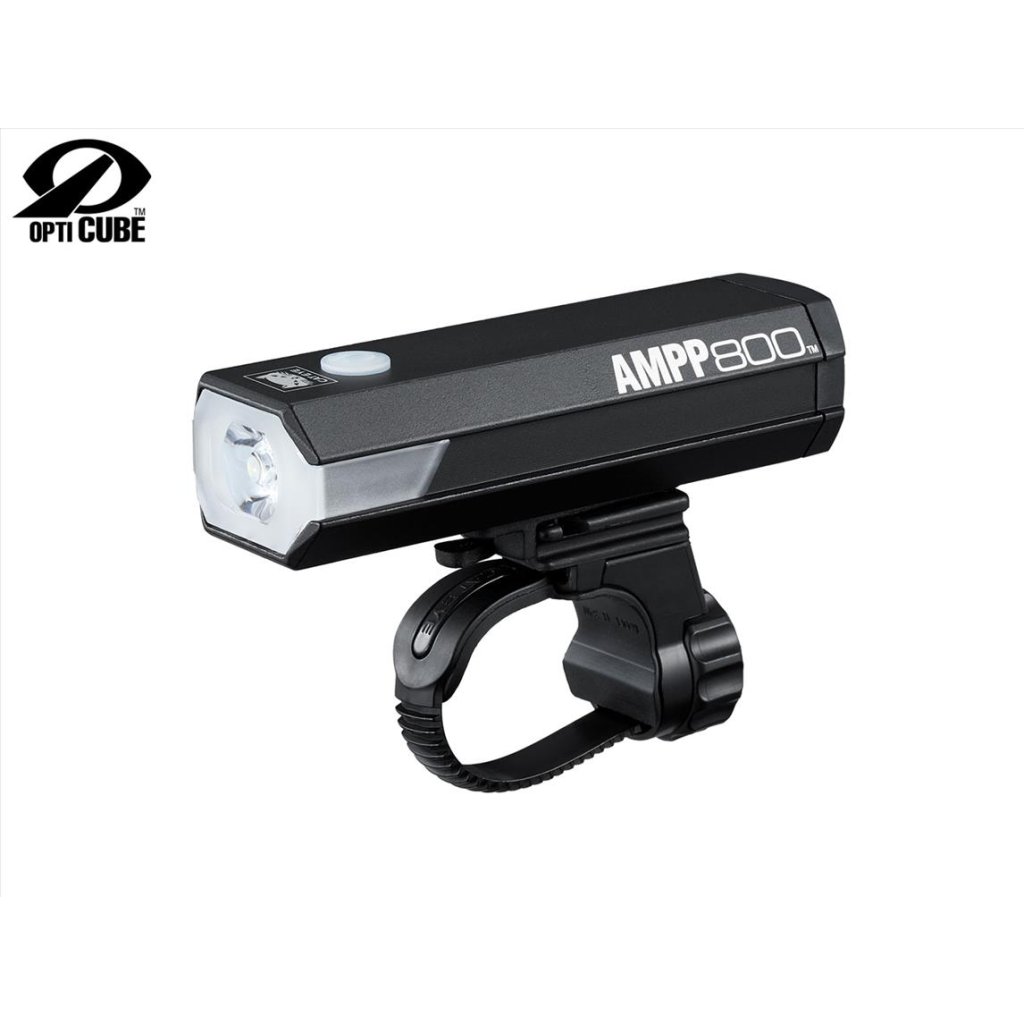 Predné dobíjacie výkonné (800lm) svetlo CATEYE AMPP800 s Alu telom a s technológiou OptiCube (špeciálna konštrukcia optických šošoviek usmerňujúce tok svetla pre lepšiu osvietenie vozovky). Indikátor kapacity akumulátora a dobíjanie integrovaný do vypínača. Súčasti svetla je USB 2.0 / Micro-B kábel.