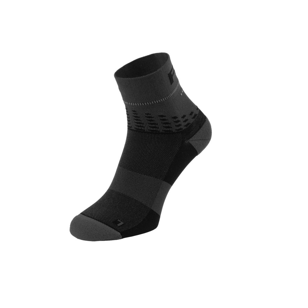 Športová ponožka s reflexnými prvkami zvyšujúca viditeľnosť a bezpečnosť. Materiál Q-SKIN® je vlákno z polyamidu 6.6, do ktorého sú ióny striebra vkladané priamo počas procesu zvlákňovania, čo obmedzuje rast baktérií a bráni telesnému pachu. Q-SKIN® sa stará o pokožku a poskytuje jej nositeľke priedušnosť, sviežosť, hygienu a pohodlie. Zloženie materiálu: 94% polyamid, 4% elastan, 2% polyester.