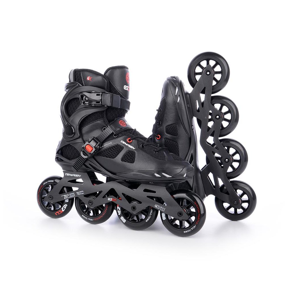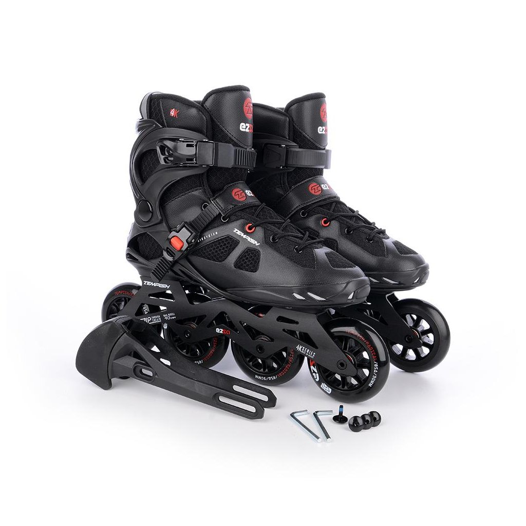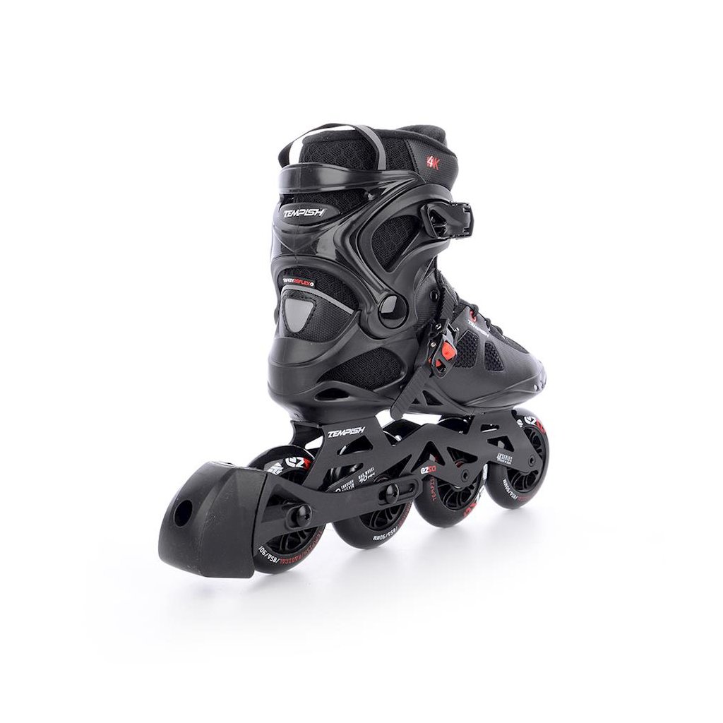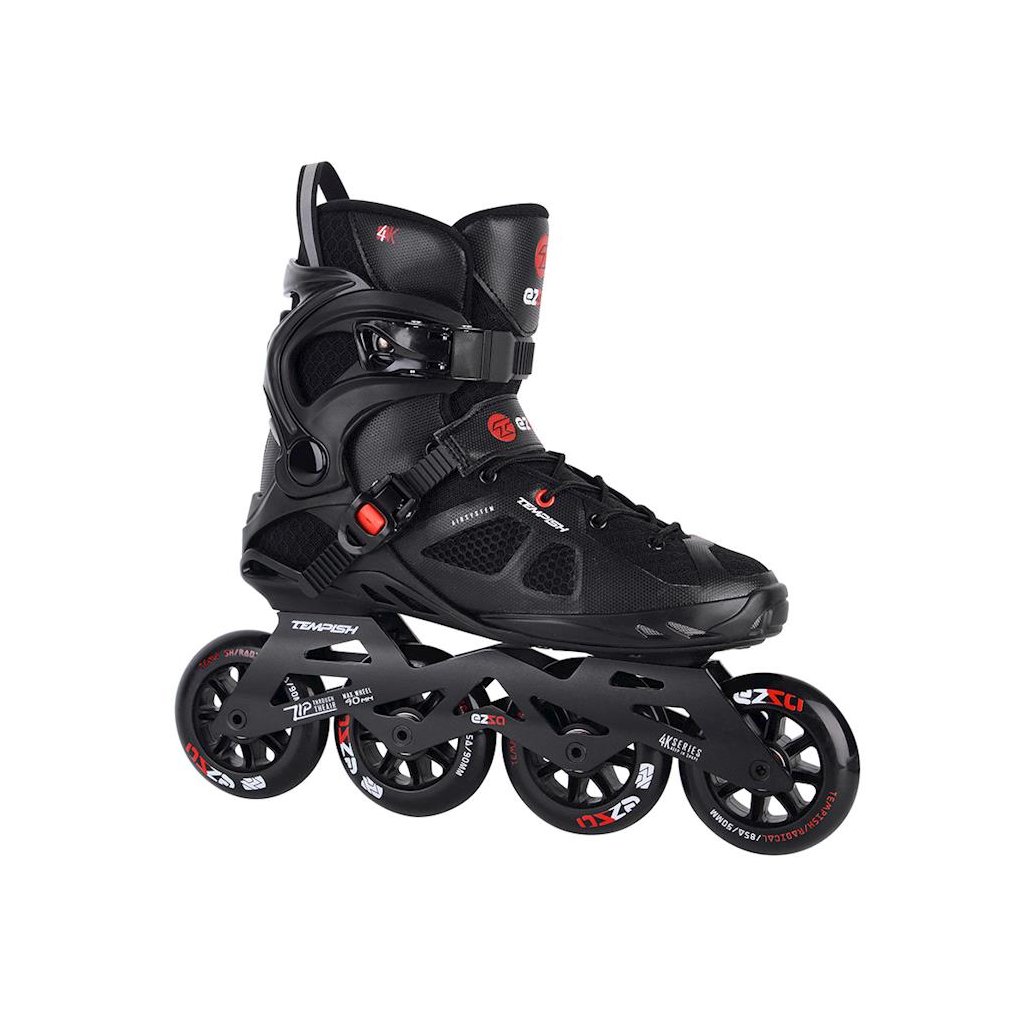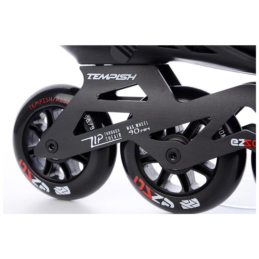 U korčúľ je použitá TEMPISH brzda univerzálna „S“. Brzda je priložená v krabici spoločne so 4-mi skrutkami - veľmi jednoduchá montáž - bez nutnosti demontovať osky a kolieska. Materiál držiaka brzdy - nylon so skleným vláknom - veľmi tuhý a pevný, ktorý umožňuje nastaviť výšku polena. Materiál klátu TPR. Korčule EZZA 90 sú osadené kolieskami zo série RADICAL, PU casting (PUC), Super Hi-Rebound (SHR). Jedná sa o vysoko kvalitné kolieska s veľmi nízkym valivým odporom a dlhou životnosťou, ktoré dosahujú veľmi nízke opotrebenie na rôznych povrchoch a výborne tlmia nerovnosti povrchu čo zaručuje naozaj komfortnú jazdu. Kolieska sú osadené ložiskami ABEC 9 hi-precision s gumovou prachovkou. Šnurovanie je klasické šnúrkami. Cez priehlavok je umiestnený spevňujúci pásik s mikroprackou.