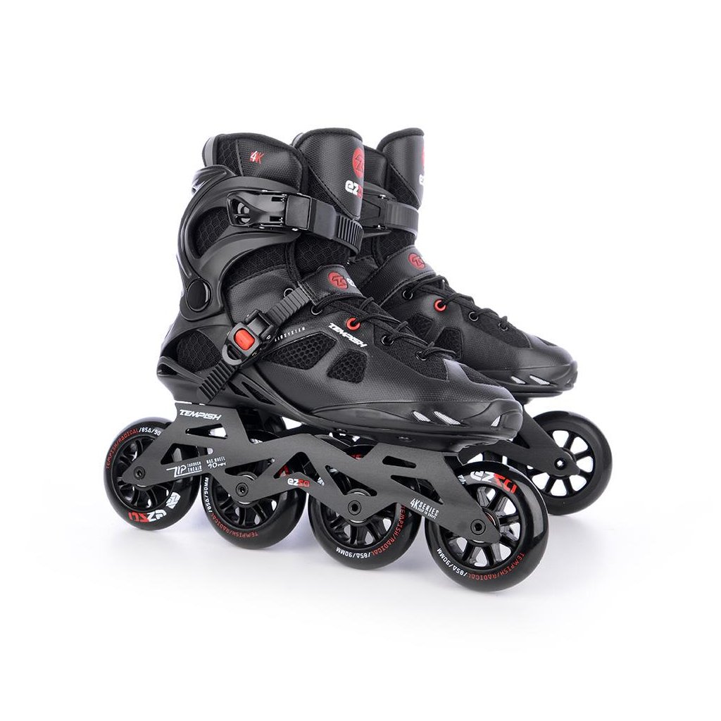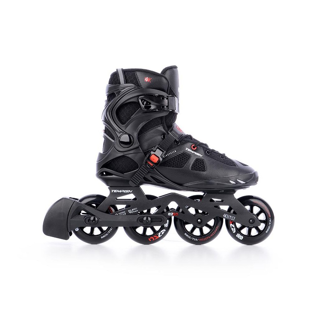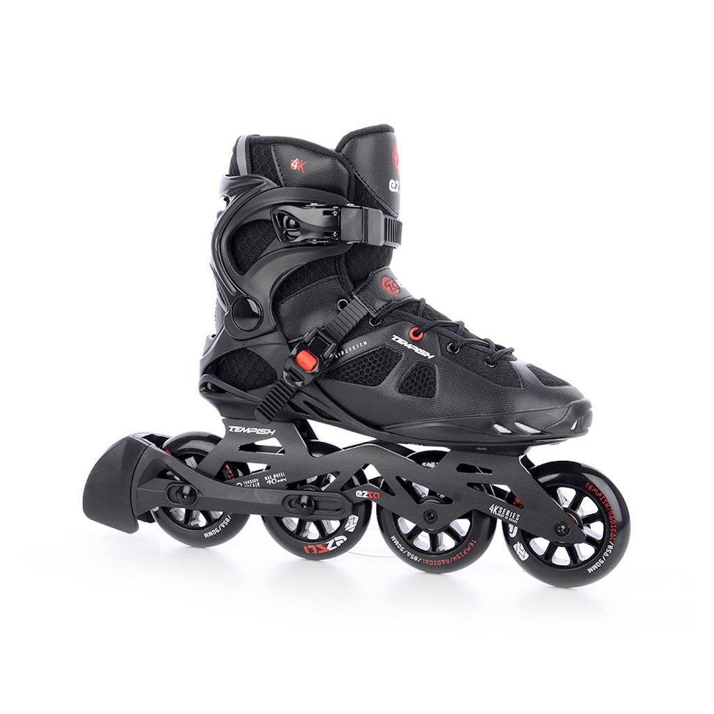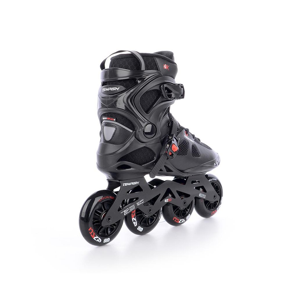 U korčúľ je použitá TEMPISH brzda univerzálna „S“. Brzda je priložená v krabici spoločne so 4-mi skrutkami - veľmi jednoduchá montáž - bez nutnosti demontovať osky a kolieska. Materiál držiaka brzdy - nylon so skleným vláknom - veľmi tuhý a pevný, ktorý umožňuje nastaviť výšku polena. Materiál klátu TPR. Korčule EZZA 90 sú osadené kolieskami zo série RADICAL, PU casting (PUC), Super Hi-Rebound (SHR). Jedná sa o vysoko kvalitné kolieska s veľmi nízkym valivým odporom a dlhou životnosťou, ktoré dosahujú veľmi nízke opotrebenie na rôznych povrchoch a výborne tlmia nerovnosti povrchu čo zaručuje naozaj komfortnú jazdu. Kolieska sú osadené ložiskami ABEC 9 hi-precision s gumovou prachovkou. Šnurovanie je klasické šnúrkami. Cez priehlavok je umiestnený spevňujúci pásik s mikroprackou.
