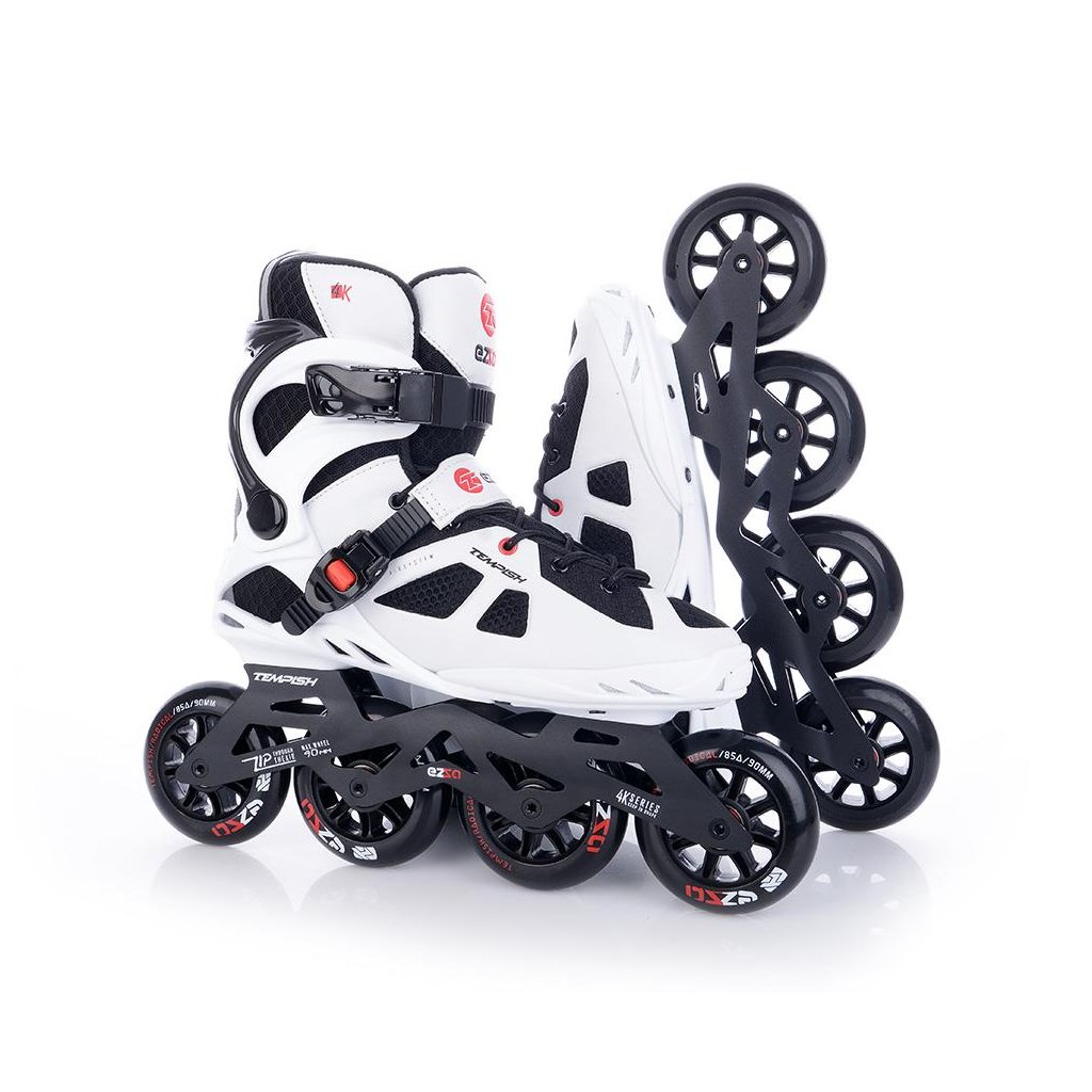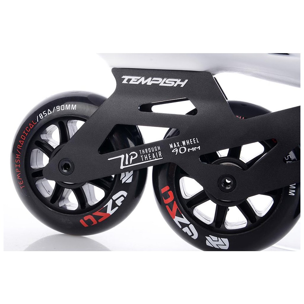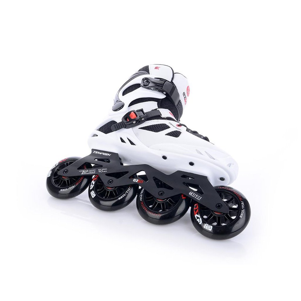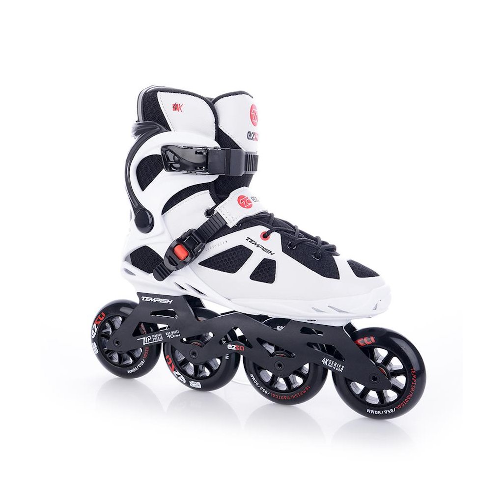 U korčúľ je použitá TEMPISH brzda univerzálna „S“. Brzda je priložená v krabici spoločne so 4-mi skrutkami - veľmi jednoduchá montáž - bez nutnosti demontovať osky a kolieska. Materiál držiaka brzdy - nylon so skleným vláknom - veľmi tuhý a pevný, ktorý umožňuje nastaviť výšku polena. Materiál klátu TPR. Korčule EZZA 90 sú osadené kolieskami zo série RADICAL, PU casting (PUC), Super Hi-Rebound (SHR). Jedná sa o vysoko kvalitné kolieska s veľmi nízkym valivým odporom a dlhou životnosťou, ktoré dosahujú veľmi nízke opotrebenie na rôznych povrchoch a výborne tlmia nerovnosti povrchu čo zaručuje naozaj komfortnú jazdu. Kolieska sú osadené ložiskami ABEC 9 hi-precision s gumovou prachovkou. Šnurovanie je klasické šnúrkami. Cez priehlavok je umiestnený spevňujúci pásik s mikroprackou.