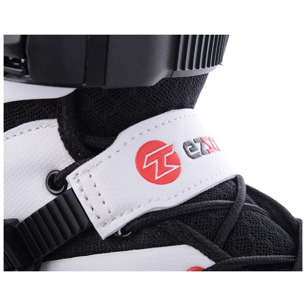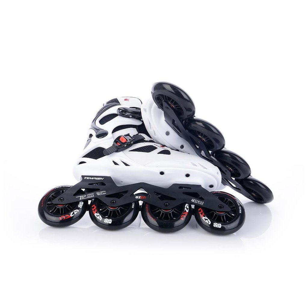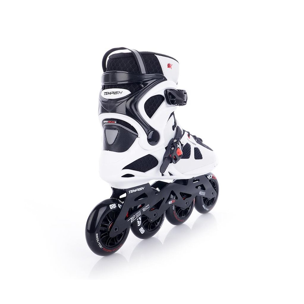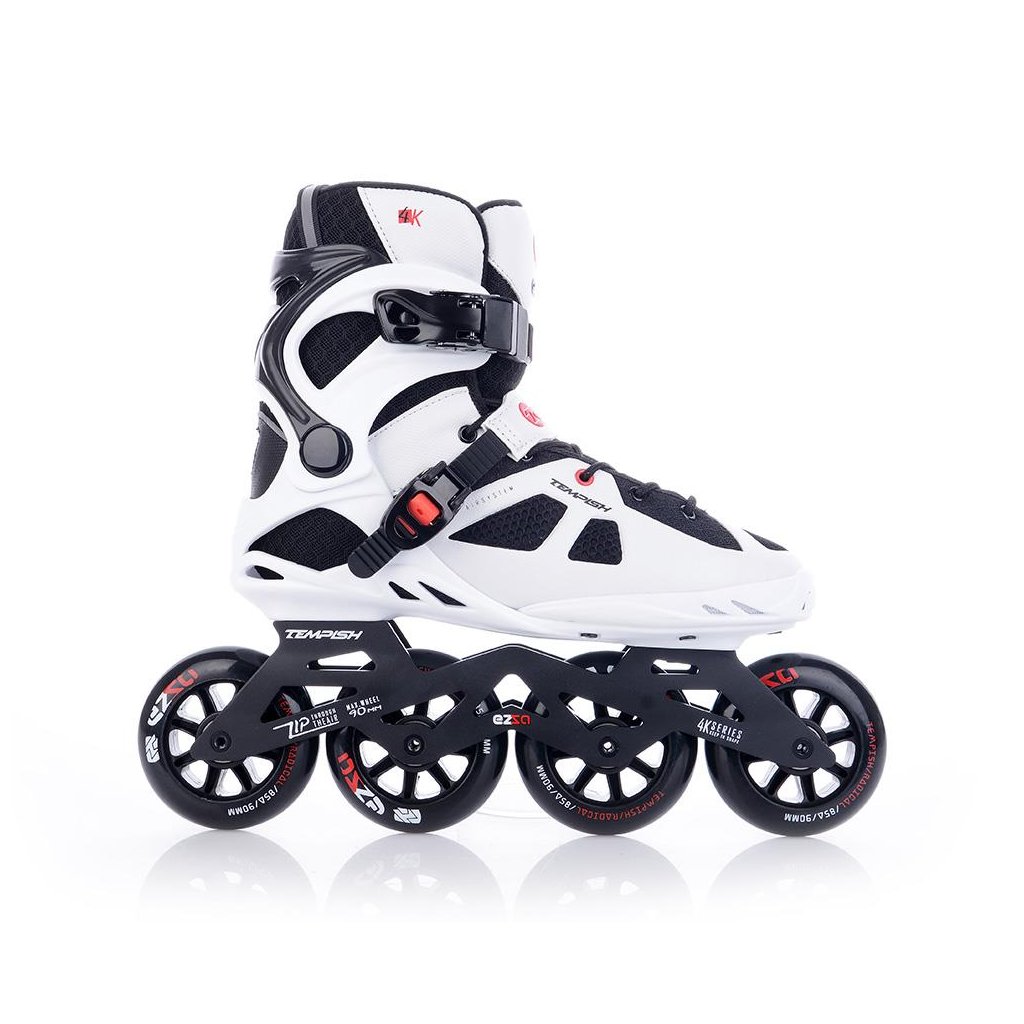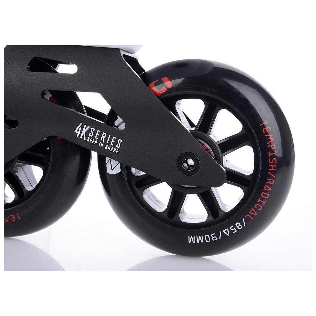 U korčúľ je použitá TEMPISH brzda univerzálna „S“. Brzda je priložená v krabici spoločne so 4-mi skrutkami - veľmi jednoduchá montáž - bez nutnosti demontovať osky a kolieska. Materiál držiaka brzdy - nylon so skleným vláknom - veľmi tuhý a pevný, ktorý umožňuje nastaviť výšku polena. Materiál klátu TPR. Korčule EZZA 90 sú osadené kolieskami zo série RADICAL, PU casting (PUC), Super Hi-Rebound (SHR). Jedná sa o vysoko kvalitné kolieska s veľmi nízkym valivým odporom a dlhou životnosťou, ktoré dosahujú veľmi nízke opotrebenie na rôznych povrchoch a výborne tlmia nerovnosti povrchu čo zaručuje naozaj komfortnú jazdu. Kolieska sú osadené ložiskami ABEC 9 hi-precision s gumovou prachovkou. Šnurovanie je klasické šnúrkami. Cez priehlavok je umiestnený spevňujúci pásik s mikroprackou.