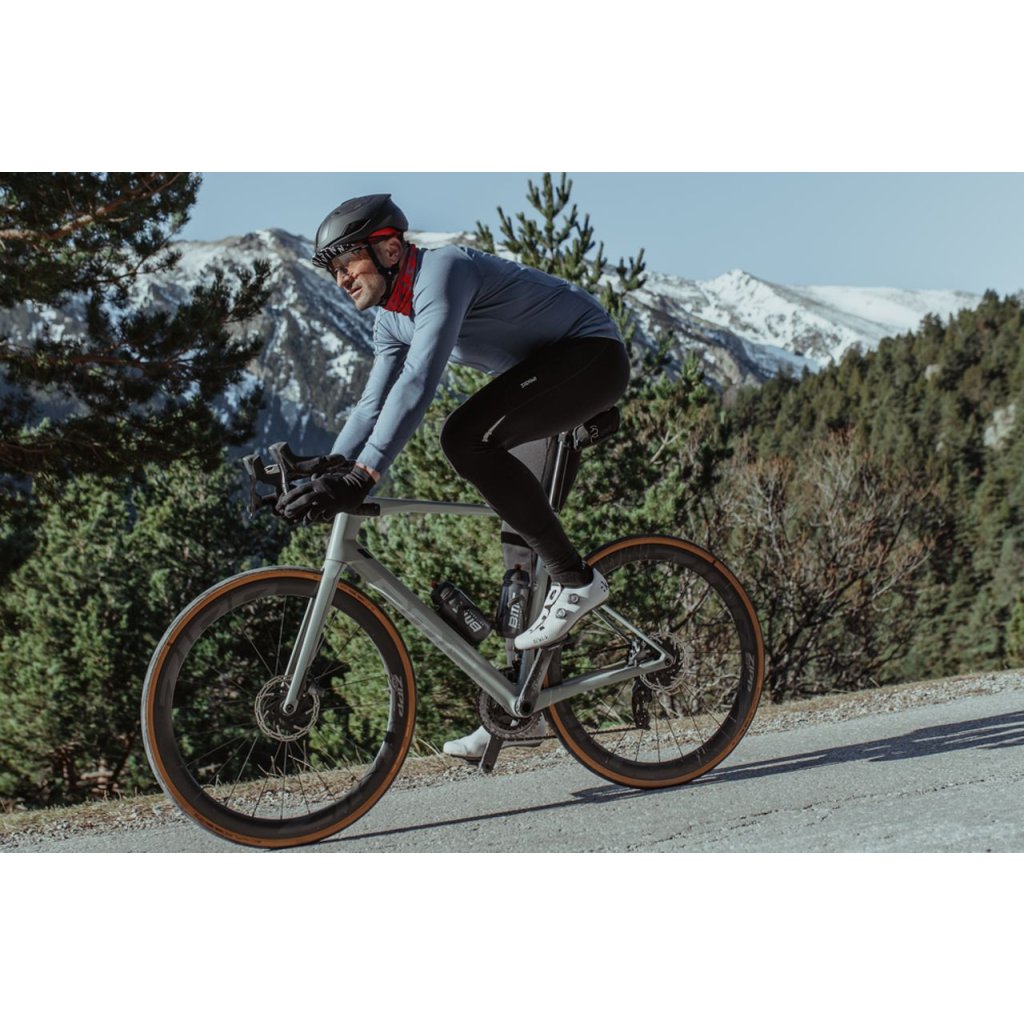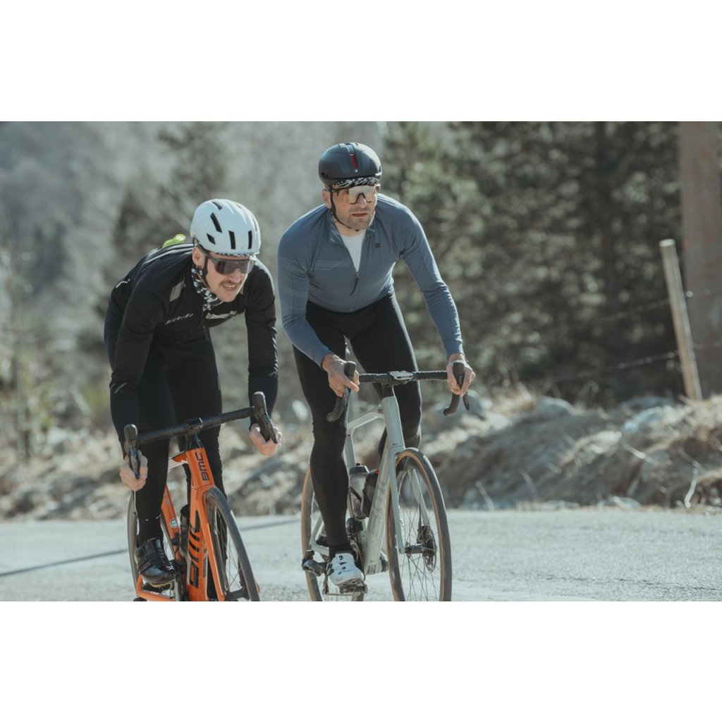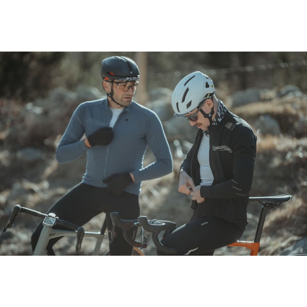 Madonna del Ghisallo je patrónkou všetkých cyklistov. Rovnako tak Vás ochráni aj pánska zimná cyklo bunda Ghisallo, ktorá je určená pre teploty okolo 0-10 ° C. Bunda bola vytváraná v spolupráci s Roman Kreuziger Cycling Academy, aby splnila náročné požiadavky cestných cyklistov. Na prednú časť bundy, ramená, rukávy a vysoký golier je použitý pružný materiál (260 g / m2) s priedušnou membránou s parametrami 10 000/20 000 (82% polyester, 7% elastan, 11% polyuretán). Zadná časť je na vďaka inému materiálovému zloženiu (76% nylon, 24% elastane) a nižšie gramáži (230g / m2) plne priedušná. Kombinácia týchto materiálov úplne dostatočne ochráni cyklistu pred vetrom, zimou a ľahším dažďom. Zároveň chrbtom odvetrá prebytočné teplo a vlhko vznikajúce pri aktívnom pohybe. V kombinácii s dlhým dresom možno ľahko použiť aj pre teploty pod bodom mrazu. Dlhý kostený zips bundy možno v prípade potreby ľahko rozopnúť aj jednou rukou. Ghisallo má vzadu tri veľké cyklistické vrecká s gumovým sťahovaním na všetko potrebné. Spodný lem má vnútorné sťahovanie pomocou gumy so silikónovým prúžkom, vďaka čomu bunda výborne drží na svojom mieste. Na ľavom ramene a na chrbte sú pruhy látky s reflexným povrchom. Ďalšie reflexné prvky sú na oboch bokoch. Bunda je ideálnym parťákom pre vychádzku vo veľmi chladnom počasí.