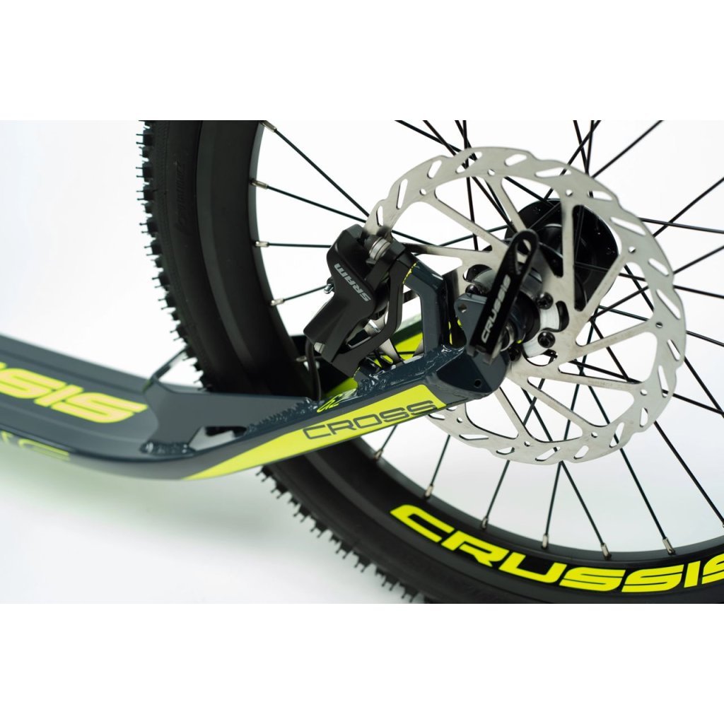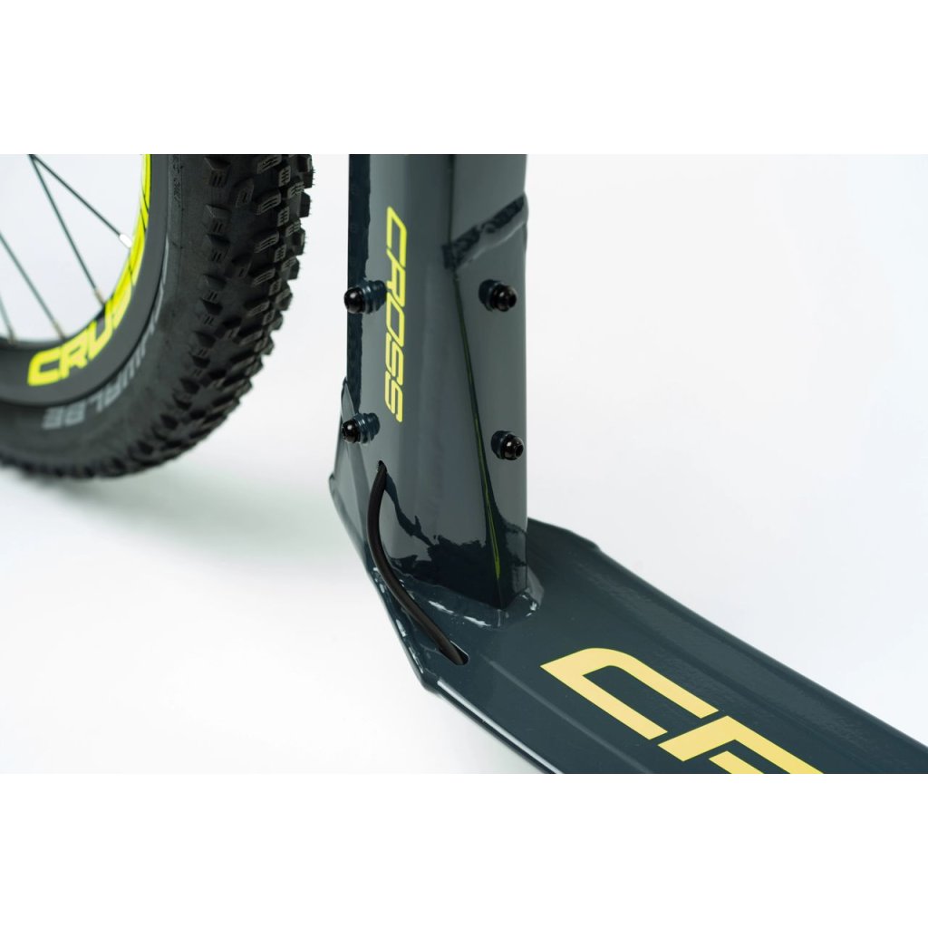 Hliníkový terénny skúter CROSS Hard 6.2 na špičkových hydraulických kotúčových brzdách SRAM s priemerom kolies 27,5"×20", hmotnosťou 9 080 kg, pevnou vidlicou a pneumatikami SCHWALBE MTB. Kolobežka je ideálna na jazdu v teréne, ako aj na jazdu po spevnených cestách. Užite si svoju obľúbenú trasu bez obmedzení! Prečítajte si, ako dopadol nezávislý test!