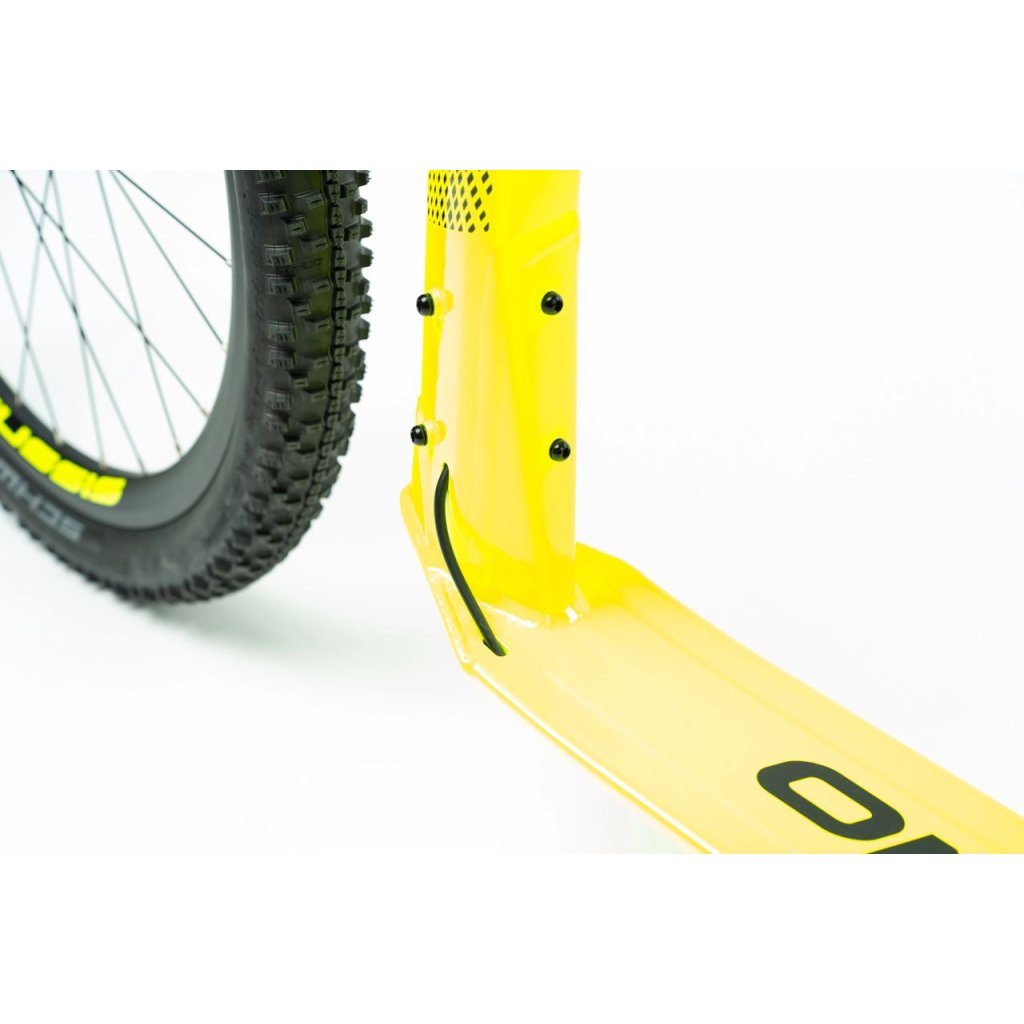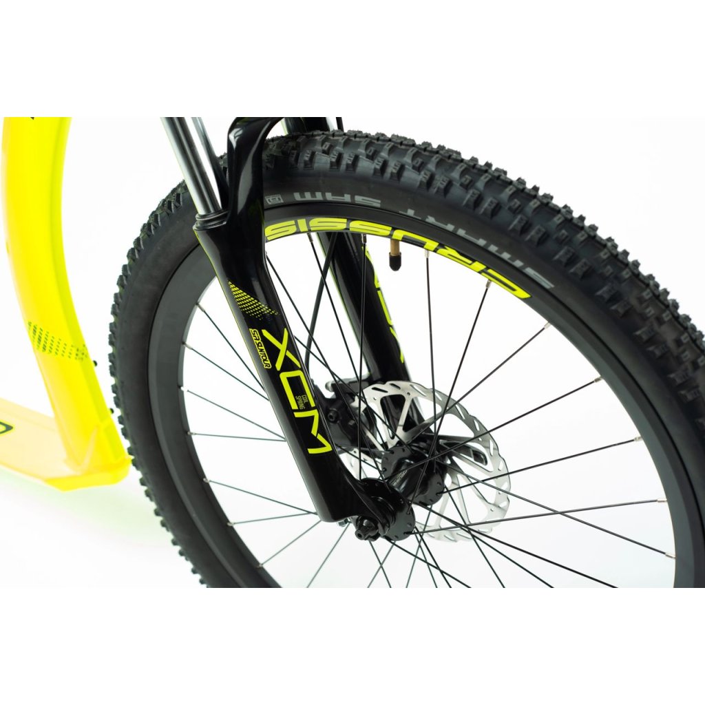 Hliníkový terénny skúter CROSS 6.2 na špičkových hydraulických kotúčových brzdách SRAM s priemerom kolies 26"×20", hmotnosťou 10,870 kg, odpruženou vidlicou SUNTOUR a pneumatikami SCHWALBE MTB. Kolobežka je ideálna do náročnejšieho terénu na zjazd alebo akčnú jazdu so psom. Užite si svoju obľúbenú trasu bez obmedzení! PREČO HLINÍKOVÝ A NIE OCELOVÝ RÁM?
