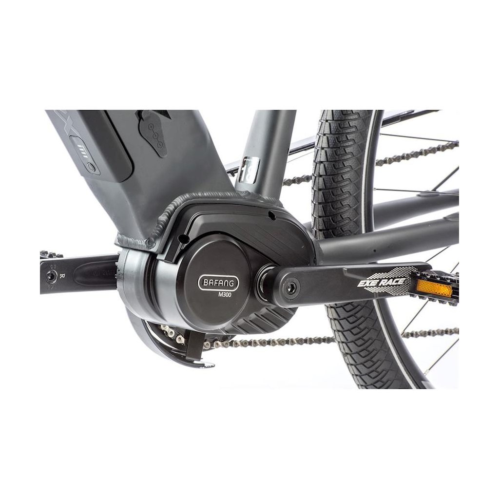 Dámske krosový elektrobicykel EXETER 2021 s hliníkovým rámom, športovým dizajnom, odpruženou prednou vidlicou, kotúčovými brzdami a rozmerom kolies 28 "a centrálnym motorom Bafang M300. Motor je vybavený integrovaným snímačom otáčok. Novinkou je plne integrovaná rámová batéria s výkonnými článkami LG s kapacitou 15Ah (540Wh). Ďalším plusom je rychlo nabíjačka s nabíjacím prúdom 3A. Vďaka ktorej sa výrazne skráti doba nabíjania batérie. Elektrobicykel je vybavené stredovým motorom Bafang M300 s nominálnym výkonom 250W a max. Výkonom 350W. Tento motor sa môže okrem iného pochváliť vysokým krútiacim momentom, ktorý môže dosiahnuť hodnotu až 80 Nm a je vybavený integrovaným snímačom otáčok. Elektromotor Bafang M300 sa rýchlo zaradil medzi zavedenými stredovými pohonmi predovšetkým vďaka svojmu kvalitnému spracovaniu. Ďalej vyniká veľmi plynulým chodom, nadpriemerným výkonom v stúpaní a tichým chodom.