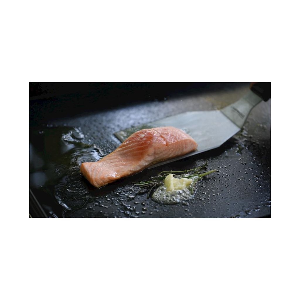 Nerezová krátka špachtľa Premium Plancha s pohodlnou rukoväťou je špeciálne navrhnutá pre jednoduché miešanie zeleniny, mäsa alebo morských plodov na vašej Planche alebo grile. Pomáha tiež pri čistení povrchu Planch a odstraňovanie zvyškov z plochy grilu.