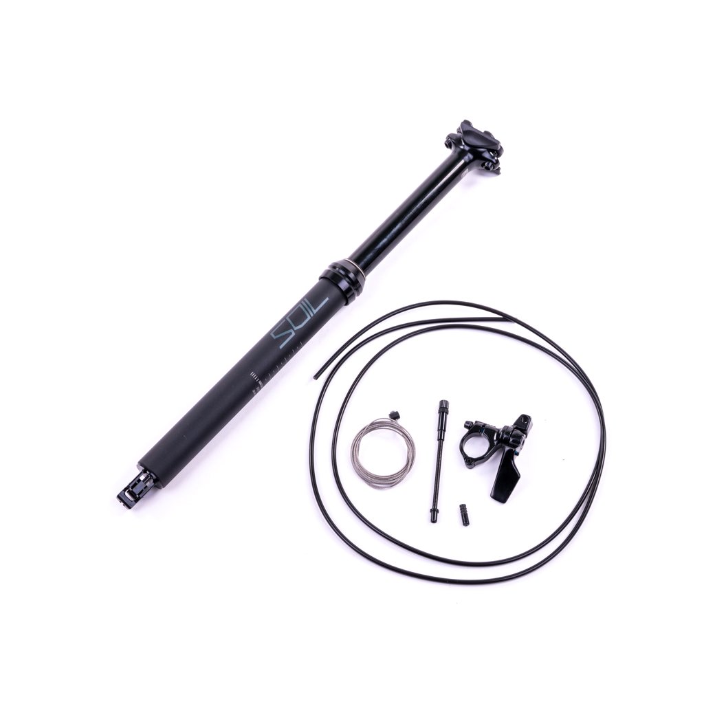 Telekopická sedlovka Spec Soil. Vedenie lanka vnútrom rámu. Zdvih sedlovky je 150 mm.