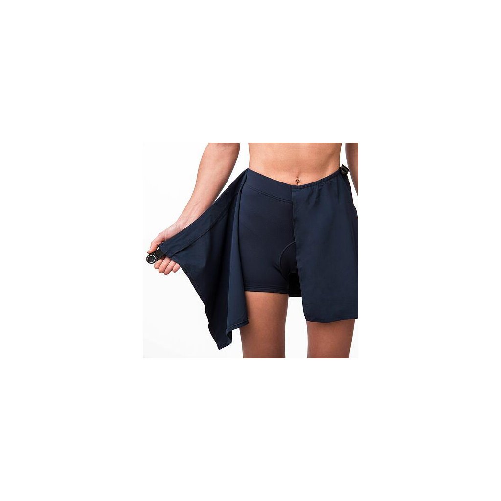 Cyklistická sukňa so všitými elastickými cyklonohavicami. Sukňa je vyrobená z pevnej tkaniny odolnej proti oderom a využíva rýchle zapínanie v páse pomocou plastovej spony. Vnútorné nohavice sú pevne spojené so sukňou a obsahujú TMF cyklovložku pre väčšie pohodlie. Superrýchly odvod vlhkosti od pokožky a ochrana UPF25 proti UV žiareniu. Ióny striebra zamedzujú zápachu a tvoria trvalú antibakteriálnu ochranu. Sukňa je zdobená odolnou, decentnou potlačou. Zloženie materiálu: 84% PES, 16% Spandex (sukňa) + 42% PES Coolmax Fresh, 51% PES micro, 7% Lycra (nohavice)