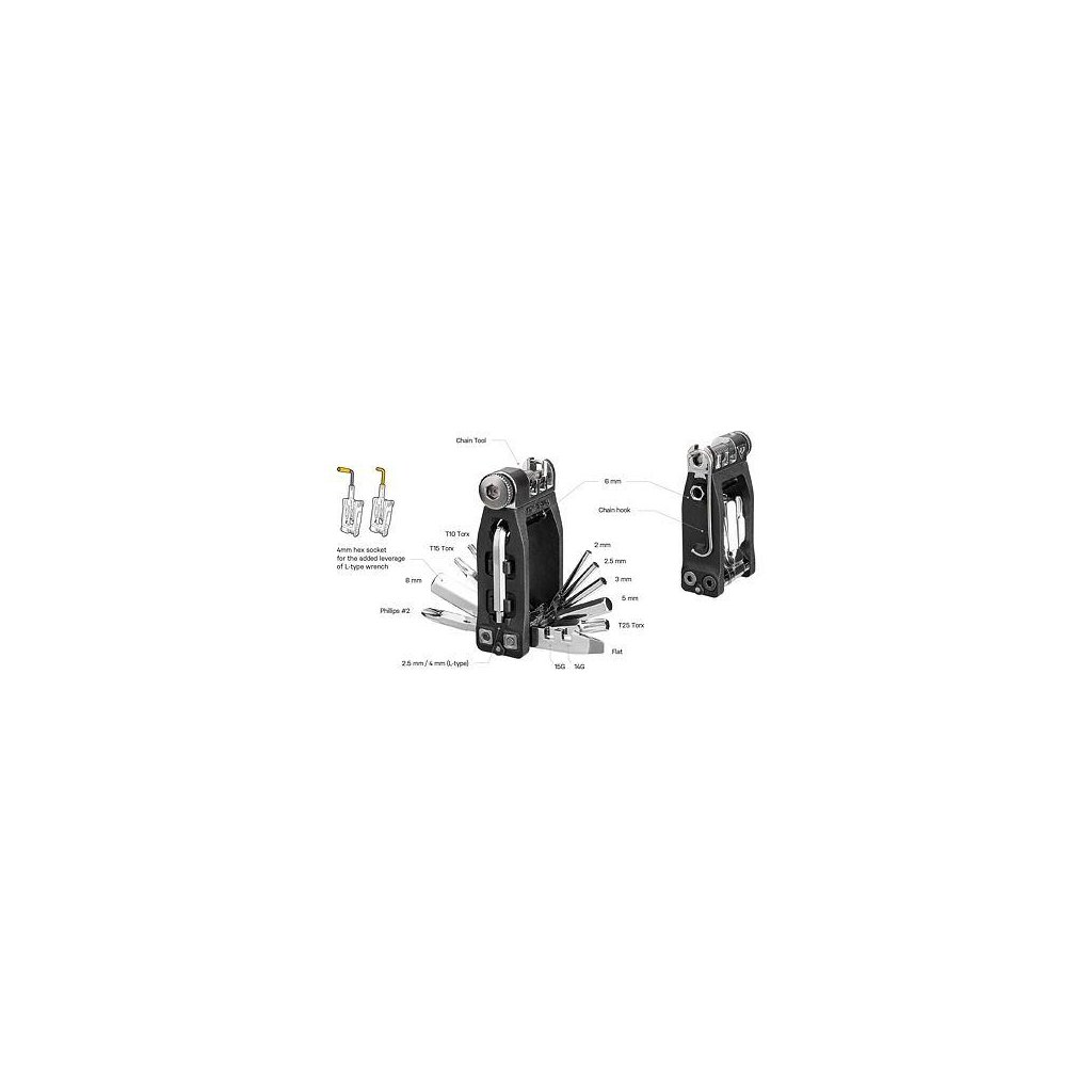 Kompaktná schránka s cyklistickým náradím, ktorú je možné upevniť priamo pod košíky na fľašu so systémom Cage Mount alebo samostatne pomocou držiaka Frame Mount. Rad Ninja využíva zdanlivo nevyužiteľný priestor na bicykli a nie inak je tomu aj v tomto prípade. Miniatúrne náradie Ninja T16+ je tak vždy jednoducho dostupné na použitie. Nástroje: • 2 / 2.5 / 3 / 4 (L-type) / 5 / 8 mm inbusy • 6 mm hex tool bit • T10 / T15 / T25 Torx® kľúče • #2 krížový / plochý skrutkovač • 14G / 15G centrkľúče • CrMo oceľová nitovačka • háčik na reťaz Materiál nástrojov: Chróm vanádová oceľ Materiál tela: Kovaný hliník Uchytenie: Ku košíkom Ninja Master+ s držiakom Cage Mount Priamo na rám, predstavec, sedlovku pomocou držiaka Frame Mount a pásikov Hmotnosť: 92 g (Ninja T16+) 4 (ToolBox)
