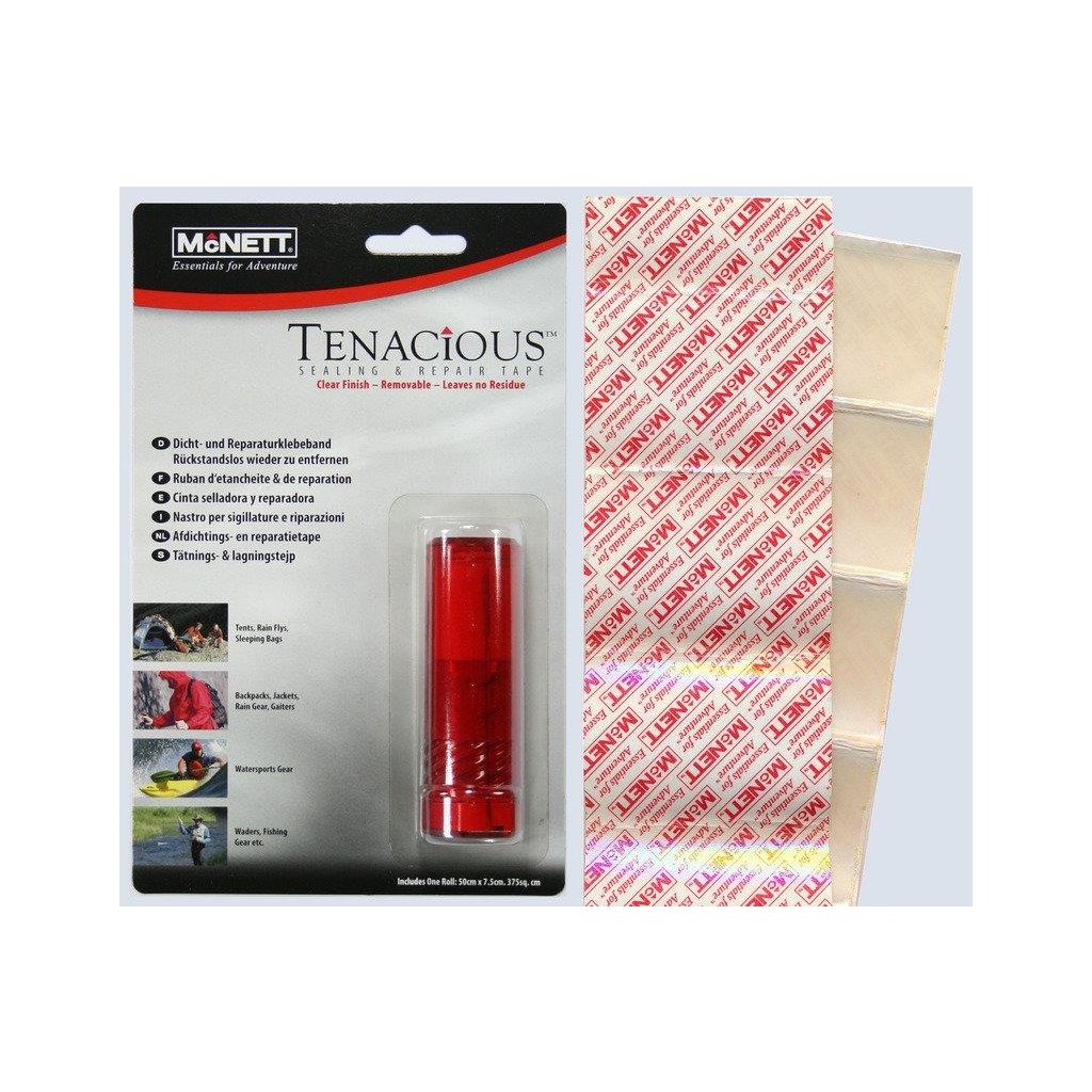 Tenacious sú samolepiace transparentné matné záplaty s tlakovo senzitívne lepiacou plochou. Návod na použitie: Stačí vystrihnúť z pásu potrebnú záplatu, pritlačiť z líca alebo rube na zlepované miesto a získame vodonepriepustný zlep, ktorý vydrží minimálne jedno pranie. Záplata výborne drží na zátěrované, t.j. rubovej strane a takisto na lícovej strane, ak lícna tkanina nemá príliš hrubú štruktúru. Záplata je vhodná aj pre havarijné prekrytie zlepu vykonaného polyuretánovými lepidlami, aby sa zabránilo lepkání pri okamžitom použití a zaistila fixácia pred dosiahnutím konštrukčnej pevnosti. Balenie: transparentný matný pás s rozmermi 500 x 75 mm v plastovej valcovej krabičke